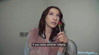 Public Agent Chanel Kiss sucks cock before being bent over in public toilets for sex