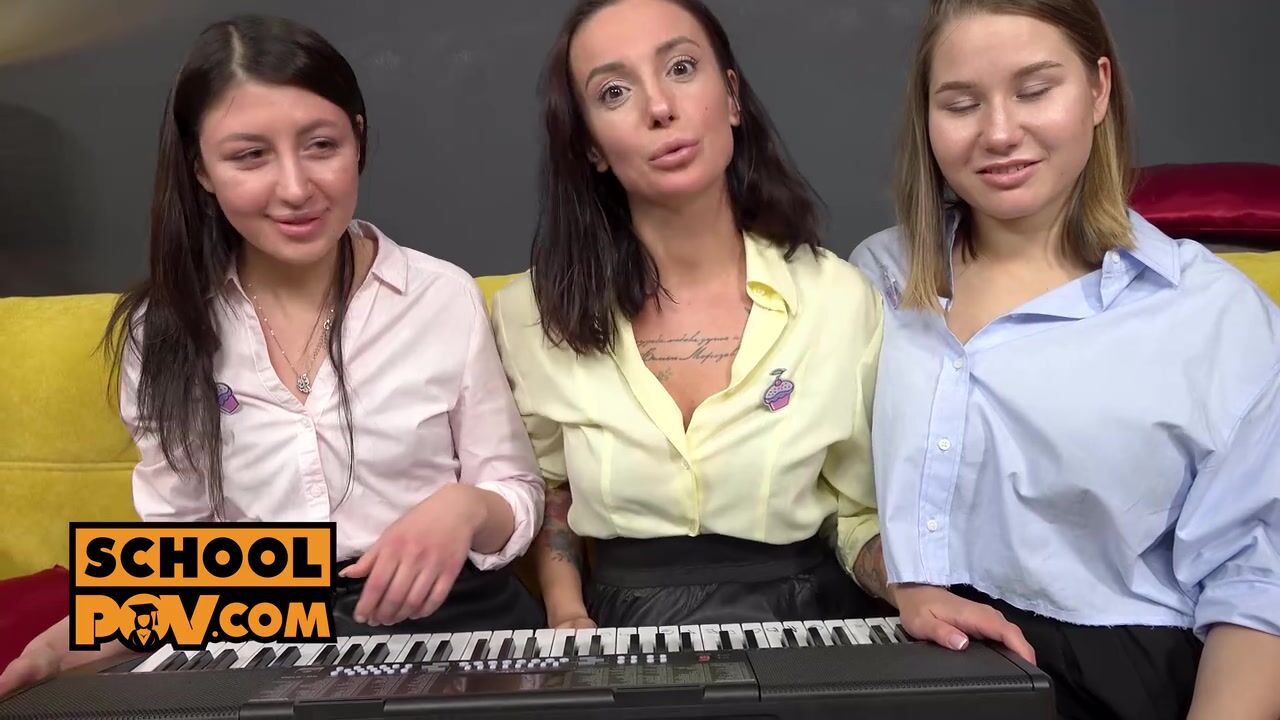 Music session with cute schoolgirl teens Julia Moon, Amalia Davis and Mary Frost gets nasty. You watch all three babes undress in POV style. They get naked and suck your dick together.