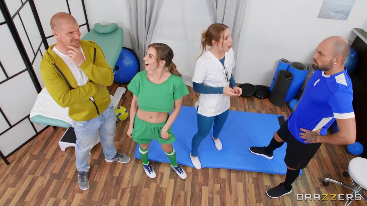 Josephine Jackson has shown up with her obnoxious boyfriend for a physiotherapy session, but their physio is short-staffed. Josephine immediately cozies up to Brian Ragnastone, who is also there for a session, and they bond over her soccer ball and perfect natural tits, flirting right under Josephine's boyfriend's nose. When Josephine is paired with Brian for tandem stretching, she uses the set up to tease him with her tits and ass, grinding into his hard cock. A break in the action allows Josephine to sneak over to the massage area, where Brian is able to oil her up and properly worship her body. When the physio finds them, Brian is stunned when he's instructed to finger Josephine. From there, the situation morphs into an oily, sneaky fuck. Turns out that the kink Josephine needed to work out was finally taking a proper-sized dick.