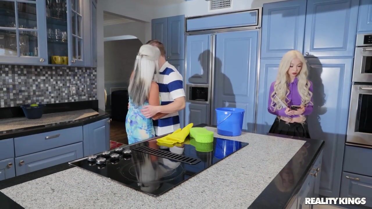 Sexy landlady Sally D'Angelo usually doesn't like her tenants having people over, but when college student Kenzie Reeves brings her boyfriend, Anthony Pierce, around, Sally's willing to make an exception. After teasing Anthony with a sneaky cock grab and her massive tits right under Kenzie's nose, Sally is thrilled when Anthony returns to the kitchen and fucks her while she cleans. Although Kenzie is distracted with a phone call, Sally decides to up the ante by getting her attention while Anthony is fucking her. Turns out that Sally needs more than a cock to satisfy her, and Kenzie is more than willing to oblige!