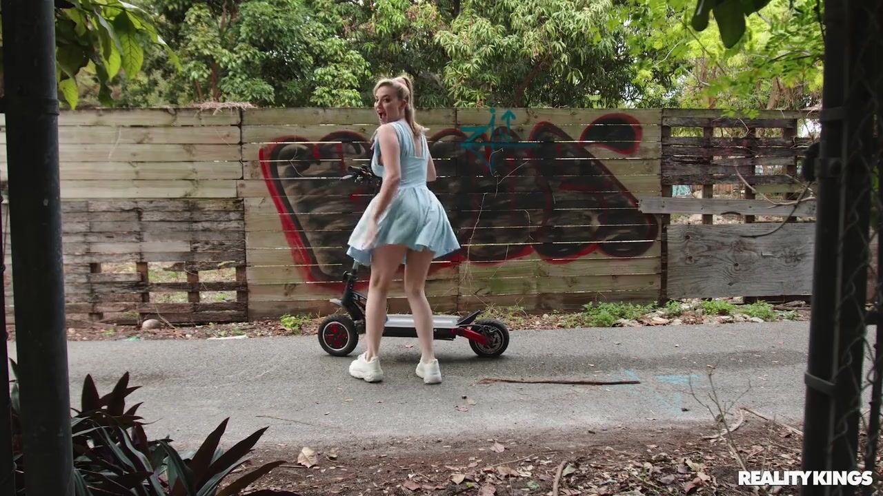 Busty blonde Blake Blossom's beautiful boobies bounce every time she goes over a bump on her scooter! That's not enough for this exhibitionist, who also delivers upskirt shots of her pretty pussy and takes out her tits to flash passers-by! Lucky Oliver Flynn is out on his porch when Blake scoots by, and he gives her a look at his big dick that's so enticing, she gives him a scooter bj, causing a nearby horny cyclist to crash! As the cyclist tries to peek through the windows, Oliver brings Blake inside where she sucks his cock and he fucks her on the couch. That dick is definitely Blake's favorite thing to ride!