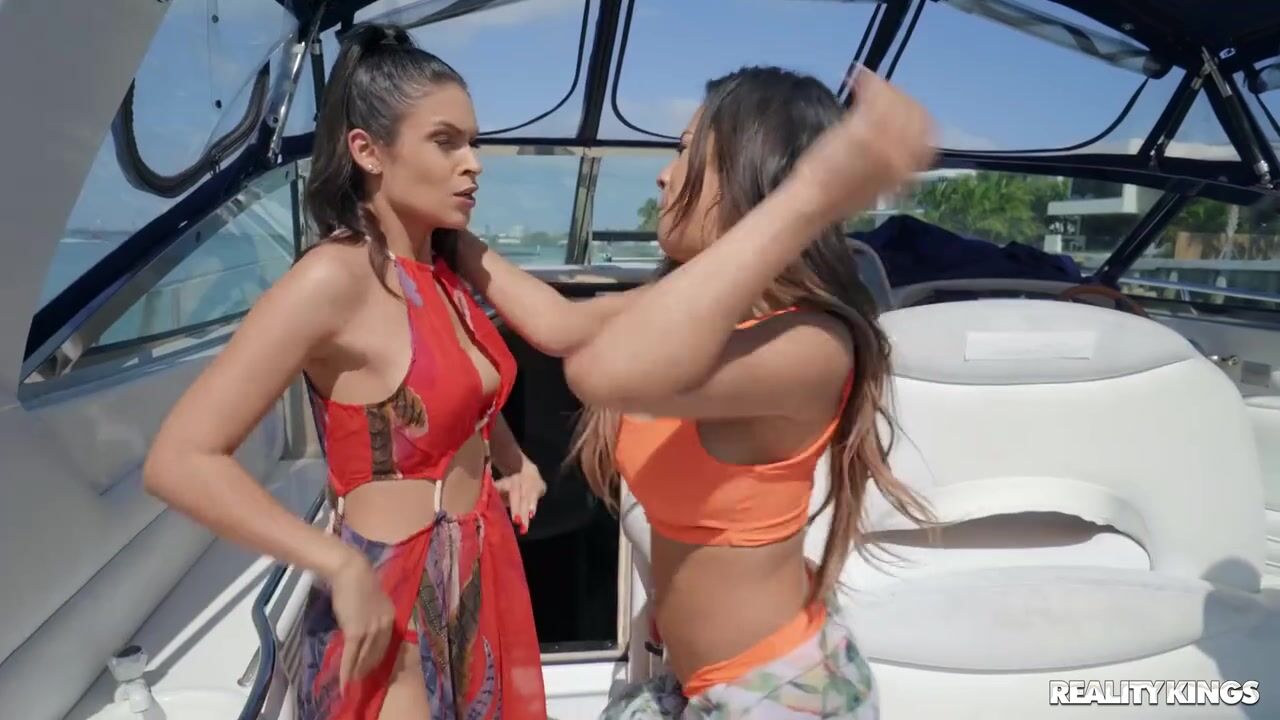 Autumn Falls and Charles Dera think they are ready to start their new life with Charles' ex-girlfriend supposedly sleeping with the dolphins in the Miami harbour. However, when fiery Latina phoenix Katana Kombat interrupts their sunny escape on a boat, sparks fly as the two sexy Miami queens fight over who gets to be Charles' true soul mate. The sight of Autumn and Katana fighting, their big titties bouncing in the sun as they slap and shout, makes Charles realize that it's time to put the past behind them and let the boat be a bridge over troubled water. Autumn and Katana kiss and make up, finding that teasing each other's pussies on the open ocean is a lot more rewarding than fighting over some guy in a captain's hat. Autumn and Katana take turns on Charles' big thick cock, sucking and slurping on it while he admires their perfect juicy butts, then let him slam their pussies right there in the harbor, twerking on his cock until he's ready to bust a nut all over their pretty faces.