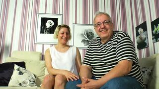 Blonde milf with big natural tits opens her eager pussy to two cocks that she fucks and penetrates in an amateur German threesome before sucking and getting her wet pussy licked with arousal