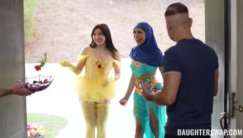 Jack and his daughter Keira invite their middle-eastern friends Calvin and his daughter Penelope to celebrate Halloween with them. Being new to America Calvin and Penelope don’t know much about Halloween so Jack and Keira show them what they do. After Keira and Penelope put on some sexy costumes, Calvin is not happy with how exposed his daughter is and wants to leave. Jack convinces him to stay by swapping daughters and playing a fun game. Every time the girls do a fun lap dance their dads reward them with a tasty treat… their hard cocks!