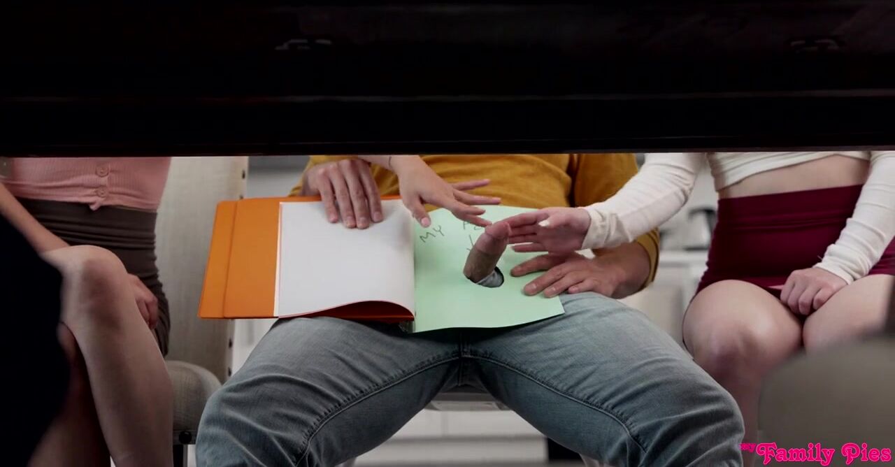 For this year's Thanksgiving, Aiden Ashley and her husband Clark Kent have brought together their blended family in Lulu Chu and Codey Steele. Haley has even invited her friend, Haley Spades. While the girls are off getting dessert, Clark instructs Codey to go get a book of things he's thankful for that he's been working on all day. When the family has gathered around the table again, Codey stands and reads his book out loud. It becomes increasingly inappropriate until the final page, which features Codey's dick in a hole because he's grateful for his penis. Clark tries to send Codey to his room, but Aiden has a different punishment in mind: Codey gets to sit at the table with his dick out while everyone else eats dessert. Aiden's punishment has an unintended consequence because it puts Codey's hardon front and center between two cock loving girls. They reach out to deliver a handie right there at the table. As soon as Aiden and Clark get up to clear their places, Haley and Lulu drop below the table to share Codey's cock in a double BJ. They can't get enough of that hardon, but they're interrupted when Aiden and Clark return. Clark tells Codey his punishment for ruining Thanksgiving is to clean his stepsister's room. Dig still waggling, Codey gets up to go do it, but Aiden yells at him to put his erection away. Later, Lulu and Haley walk in on Codey as he's sniffing a pair of Lulu's panties under the guide of cleaning her room. Lulu tells him it's a good thing he found those because she was looking for them. She goes on to lift her miniskirt and show she's not wearing any underwear. Her friend Haley does the same thing. Codey tries to leave, but the girls tell him he's not going anywhere and pin him to the bed so they can have their way with him.Lulu takes the first reverse cowgirl ride on Codey's hardon as Haley rubs Lulu's clit. The girls tag out, with Haley sliding down onto Codey's dick as Lulu masturbates beside them. Haley continues to get her pussy pounded as she rolls onto her back and spreads herself wide open for her BFF's stepbrother to have his way with her juicy twat. When Codey has satisfied Haley, Lulu takes her place. Codey manages to get his stepsister to cum, then gives in to the girls begging him to stuff Lulu full of cum like a Thanksgiving turkey. Codey does as he's told, which leaves Lulu also feeling grateful for her stepbrother's dick.