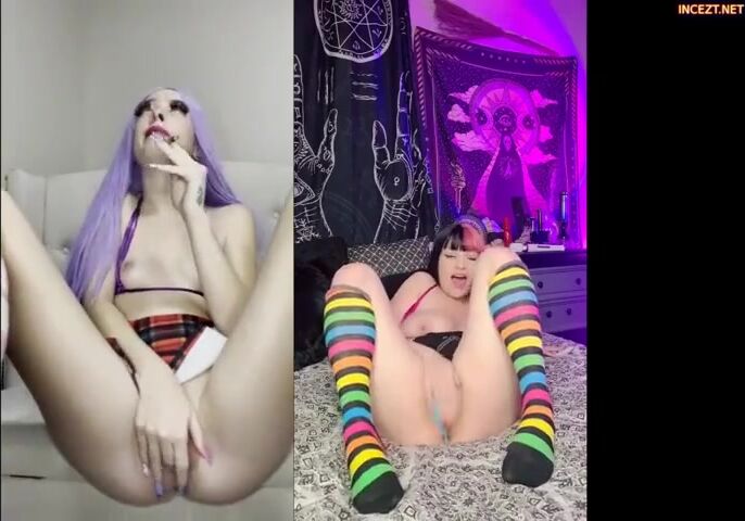 My sister face times me, I don’t know if she’s around our parents so I try to hide my smoke, when I notice she’s at home alone smoking I don’t hide mine either and I start to smoke, she asks where I am and to I reply that I am just at my dealers place, my sister wants me to pick her up something to smoke since she no longer can, I agree but I don’t have anymore cash on me. I begin to laugh and my sister proceeds to ask me what is so funny, I tell her that my dealer wants us to masturbate to each other and then he will give us even more to smoke. I dont mind seeing some tricks my older sister might have, and my sister is feeling quite good and she is almost out of her smoke, we both show off our tits and our ass in our tiny skirts, as we begin to finger ourselves and rub our cummie juices all over our clits