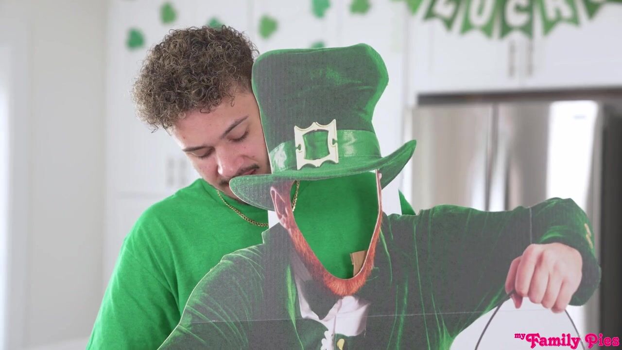 Braylin Bailey and her stepbrother Apollo Banks are decorating for a St Patty's party for Braylin's mom. Neither of them wants to be there, and Apollo deals with it by acting out. At first he begins miming a leprechaun fucking. When Braylin calls him on that, Apollo grabs a scissors and cuts the beads from around her neck. Kneeling, Braylin begins picking them up only for Apollo to pull her tight miniskirt up to reveal that she has no panties on.Braylin thinks that's the end of it, but Apollo sticks his dick through a leprechaun glory hole. She tells him to stop fucking around, but Apollo swears his dick is stuck. Braylin finally agrees to give him a reluctant handie to try to deflate his erection. Apollo can't cum, so Braylin tries a BJ. That still doesn't work, so Braylin gets on her feet and lets Apollo fuck her from behind.Apollo is finally free from the cutout, but Braylin wants that nice fuck stick to take her all the way home. Peeling off her clothes, she hops onto the island to get proper banged in the kitchen. Then she rides Apollo in reverse cowgirl so she can feel him from a different angle. On her feet, Braylin takes Apollo from behind one last time until he fills her up with his sticky St. Patrick's Day surprise.