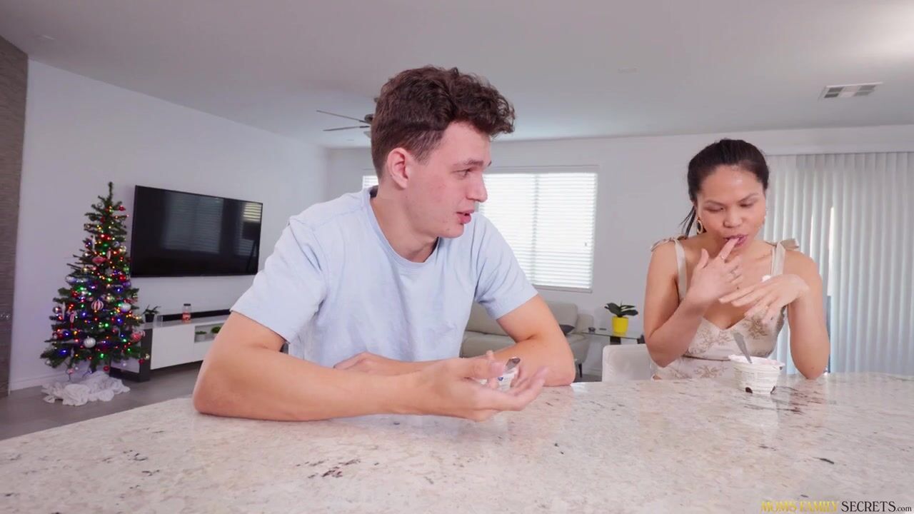 Evie Ling is a super hot milf who has a new husband and a new stepson in Josh Rivers. Unfortunately, Evie's hubby is out of town and she's horny all the time. When she goes into Josh's room to do the laundry, she finds his cum covered boxers. The sheer amount of cum all over the place is more than Evie can stand; she pulls down her thong and masturbates right on Josh's bed while admiring the proof that he's a cum dispenser.The next morning, Evie and Josh are eating yogurt for breakfast. Evie accidentally on purpose drops a big spoonful of yogurt and makes a big show of licking it from her fingertips. When Josh doesn't get the hint, Evie gets even more up front about her needs. She waits for him to be in his bedroom and then changes into lingerie. Putting on a fluffy robe over top of her getup, she goes to Josh's room and asks what he thinks of her gift for his dad. When Josh seems receptive, Evie pops her boobs out and tells her stepson that she just loves cum before going in for a BJ.You can get cum without fucking, but that's not what Evie is hoping for. Laying on the bed, she spreads her thighs so that Josh can fuck her properly. Flipping onto her belly, she keeps their good times rolling with Josh's help. Evie takes another round of fun on her back, then goes for a stiffie ride as Josh guides her pace with his big hands. Cowgirl and then reverse cowgirl finally bring Josh to his finish line. He pops off in Evie's mouth, giving her a nice load of his man juice to enjoy.