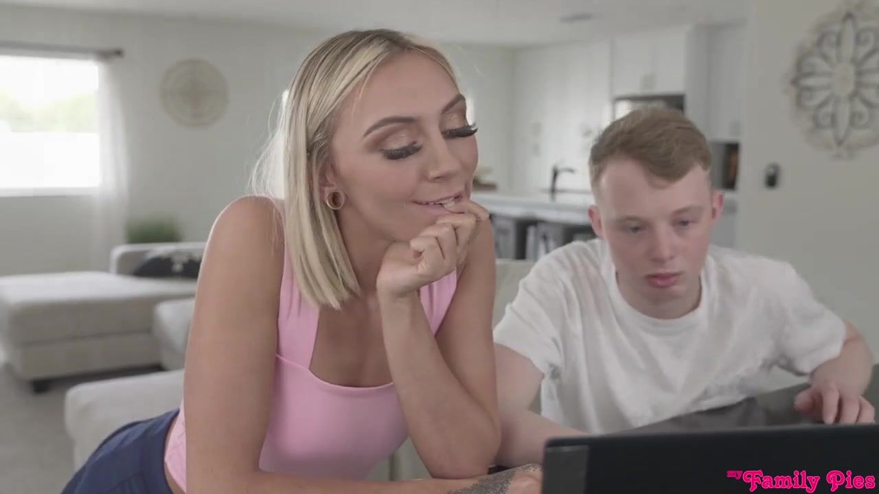 Chloe Temple has a new stepdad and stepbrother, and she's really loving the life with two unrelated guys in the house. She spends plenty of time flirting with her stepbrother, Jimmy Michaels, but won't fuck him because he's just not ready for her yet. Her stepdad, Danny Steele, is a whole other story.While Chloe is helping Jimmy with his computer, she hikes up her miniskirt and tugs her thong to the side to invite Danny inside. He slides on home, fucking his stepdaughter from behind right behind his stepson's back as Chloe holds the moan. They quit just as Jimmy turns around, successfully getting away with it.The stepfam is having movie night, which means Chloe has the chance to cuddle with Jimmy while she rubs her feet against Danny's dick beneath the blanket. Of course he spoon fucks Chloe while she once again holds the moan. When Jimmy leaves to make more popcorn, Danny and Chloe take full advantage. She rides him in cowgirl and reverse cowgirl Sucking her own juices from the D, Chloe gets on her knees for some doggy and then rolls to her back so that Danny can give it to her trimmed pussy. Danny delivers a nice creampie just as Jimmy walks in and discovers their secret.