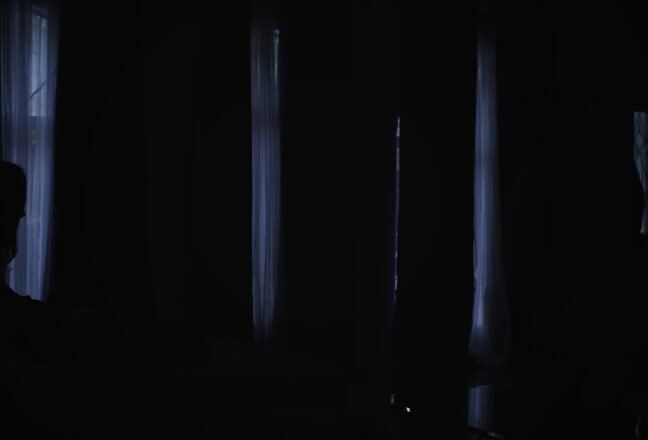 Stepson (Nathan Bronson) enters the pitch-dark living room at night, and stepmom (Shay Sights) greets him with: "Sh! Your father's sleeping". He bumps his knee noisily on the furniture, shouting out in pain. He hops on one leg to the couch to sit, and stepmom covers her mouth laughing.