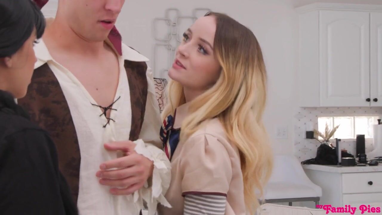 Dressing as their favorite characters from recent media for Halloween, Maria Kazi and Aria Valencia are each hot as hell in their own way. Aria goes with gloomy Wednesday, and Maria goes with robotic Megan. When they're ready, the girls wait in the hallway for Aria's stepbrother, Alex Mack. Dressed as pirate, Alex is a sight that the girls can't wait to enjoy more of.When the girls argue over Alex, Alex settles the problem by saying they can both have him. That works for both Maria and Aria. Leading their pirate to the couch to explore his booty, the girls work to blow him with a sloppy double BJ. Alex's hands are busy as he slides them all over Maria and Aria's bottoms. When Maria climbs into his lap and slides down on the D, Alex squeezes and kneads that ass while Aria watches and masturbates.It becomes a true threesome when Maria lets Aria have a reverse cowgirl ride while Maria jiggles Aria's titties. Getting on her knees, Maria takes a doggy styles pussy pounding while her mouth gets busy eating Aria's coochie. Tagging out, Aria lays with her knees bent nearly to her shoulders and Alex between her thighs with Maria riding her tongue. Alex can't hold back another moment; pumping his stepsis full of cum, Alex leaves Maria with a treat to lap out of Aria's snatch.