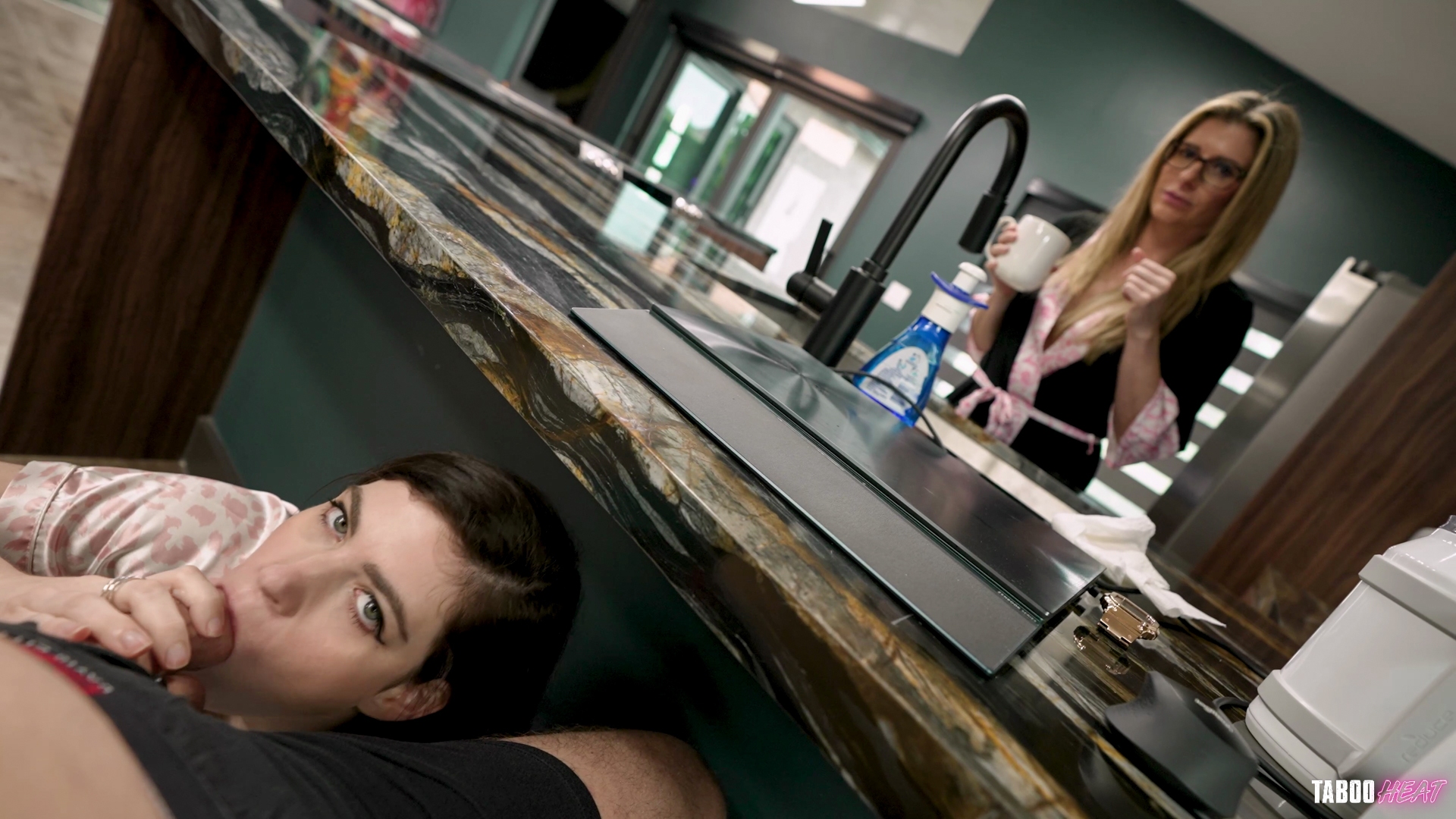 Nicole is wearing a black dress when she remembers that she was supposed to send nude photos to me, her step-dad! She strips out of her dress but she leaves her black high heels on. Then she snaps a few nude photos with her cell phone. She attempts to send them to me, but she accidentally sends the photos to her step-mom, Cory instead! Cory runs into Nicole's bedroom and she questions her about the photos. Nicole confesses that she meant to send those to her step-dad instead of her! Cory starts to get upset but once she calms down, she asks Nicole to undress her. She wants to have some fun too! Once Cory is completely naked, she asks her if she will suck on her nipples. Nicole does as she is asked. Nicole starts to eat Cory's pussy out next, and she continues to eat her out until she cums hard! Cory wants to return the favor so Nicole lies down this time and Cory climbs on top of her. She licks and sucks on her step-daughter's nipples before she makes her way down to her pussy. Cory eats her pussy out until she cums hard in her mouth! Then, Cory grabs Nicole's hand and the two of them walk hand-in-hand over to the closet. They close the door behind them and they wait for Luke to find them...