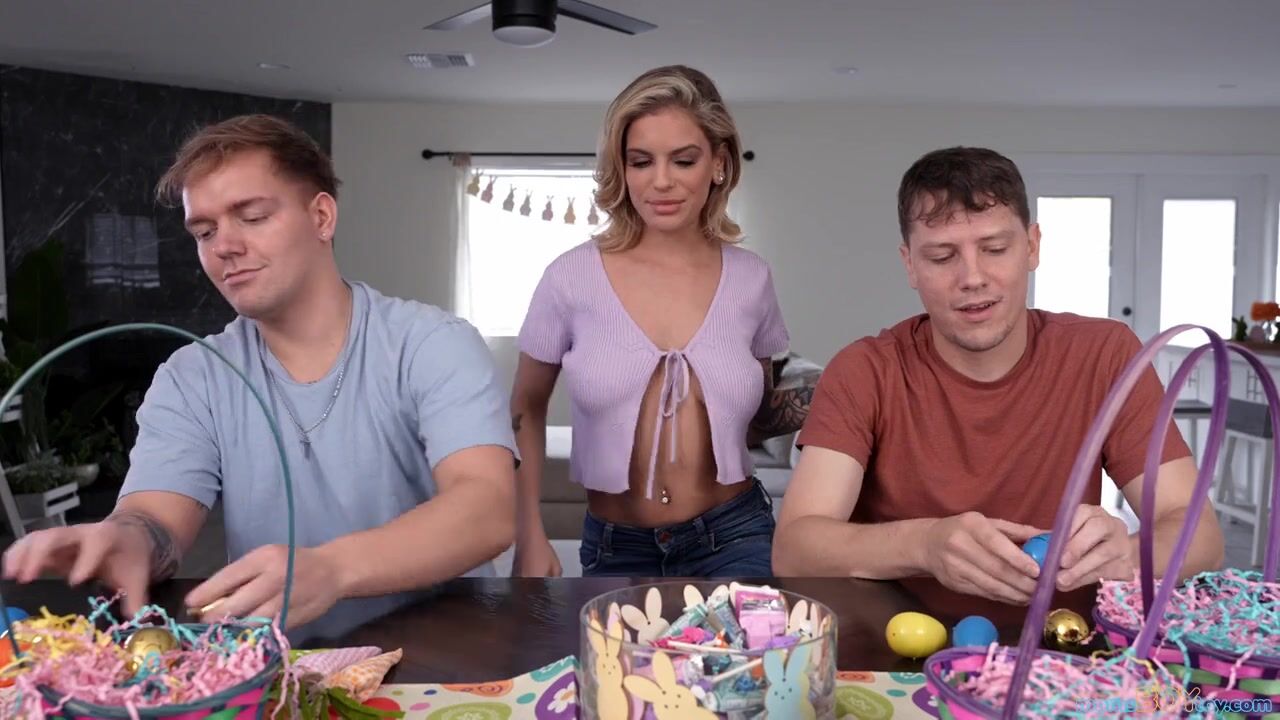 Jesse Pony wants a boy toy or two for Easter. She decides that her stepson, Joshua Lewis, and his friend Rion King will do just fine. She teases Rion with her body and then calls them over to help her with the Easter eggs. She gives them evidence of her fertility and makes it clear that she's ready to have her eggs inseminated.When Jesse returns later, she finds the boys eating candy and still clueless. Leaving all coyness behind, Jesse tells them that they're going to be her boy toys for the rest of the day. She gets on her knees between them to deliver a handie to each dick while alternating which one she's sucking off.Sitting Rion down, Jesse rides him in reverse cowgirl as she continues to slurp Joshua's dick. Then she gets on her knees to have Joshua do her in doggy as she sucks her juices from Rion. Turning around, she swaps who's fucking and who she's blowing. Then Jesse gets on her back so Joshua can glut her with a creampie as she's sucking Rion's balls. Rion gets to double dip one last time then pulls out to blow his load on Jesse's tits, leaving her sticky with her Easter treats.