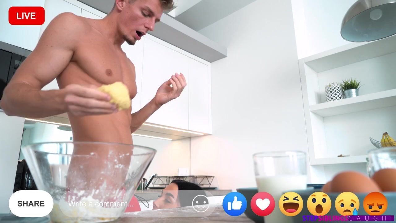 Simon Kitty has been doing naked livestreams for her followers. Today's sexy show is making muffins. Wearing only her apron, Simon gets to work. She sprinkles her big tits with flour and shows plenty of T&A as she begins mixing everything together. Just as thinks are getting good, her stepbrother Matthew Meier comes into the room.Matthew wants to know what Simon is doing, but she pulls him in to help even as she tries to explain. Matthew can't believe he's getting to see his hot stepsis in the nude, but he does as he's told and begins kneading the dough. Simon decides to make the show more interesting by getting on her knees to blow Matthew in preparation for giving him her muffin.Matthew puts Simon on the counter so the Internet can watch him eat his stepsis out. Then he shoves it in as Simon begs for more. She rolls onto her side to change up the angle of penetration, then gets on her knees on a chair so Matthew can do her in doggy. Sitting Matthew down, Simon rides him in reverse cowgirl and then in cowgirl until she's finally sated. Once Simon has taken a nice facial on her knees, she thanks Matthew sweetly for helping make her show even better.