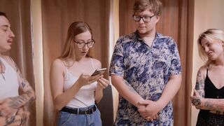 A cute group of friends meet up for some strip games, and this time they decide to play musical chairs. With very clear rules, once the music stops, each of them needs to sit down and grab a chair. The last one standing, loses a piece of clothing, and the one naked first ends up the loser, making the winner cum in whatever way they decide