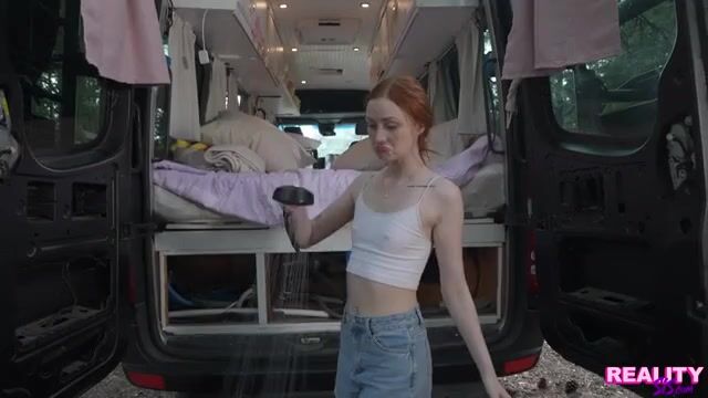 Scarlet Skies has a brand new van that she and her stepbrother Parker Ambrose have converted into housing. Now she’s showing it off online. She gives us a tour as Parker begins driving for their very first road trip.At the end of the tour, Scarlet shows how she showers. She intentionally sprays herself and gets her white shirt wet, then peels off her shorts and panties. Parker is freaking out that they may get caught, but Scarlet thinks it’d be hot to jerk Parker off when they might get caught. Parker insists they go into the van, but he lets Scarlet tug his pants off and gobble that dick.The van has plenty of fun handholds to use as they fuck. Scarlet gets on top and hangs on as she rides Parker’s dick in cowgirl. Turning around, she leans forward to keep going in reverse cowgirl. Scarlet gets on her knees to get dicked down in doggy, then onto her back so Parker can do her as he kneels between her thighs. As Parker pulls out so Scarlet can jerk him off all over her landing strip muff, the redhead comments it would have been more fun outside.