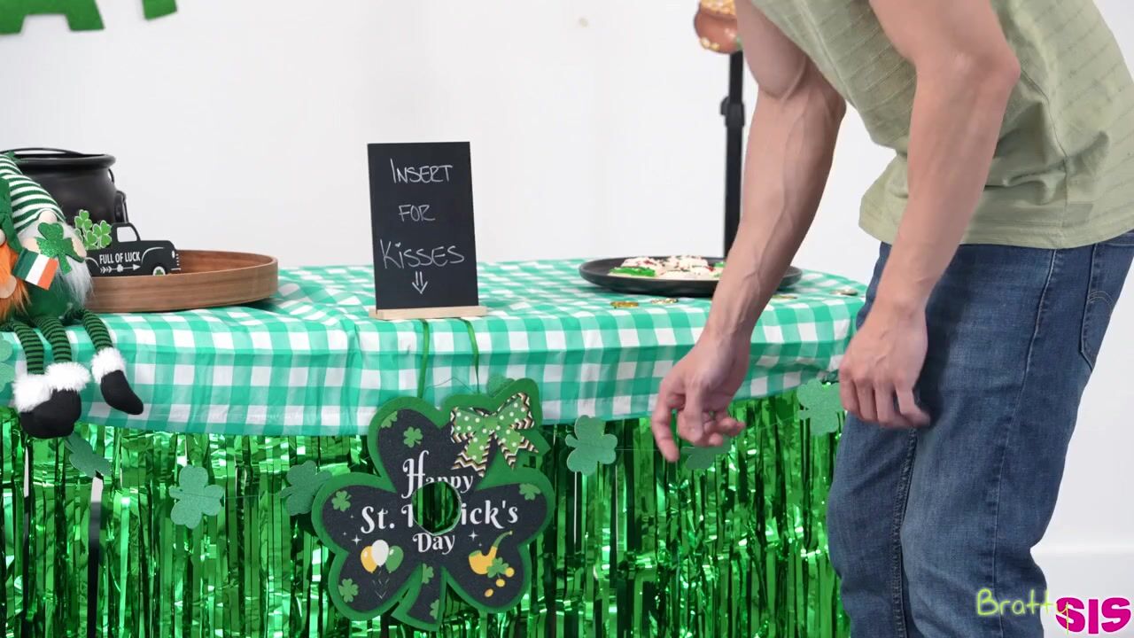 Della Cate is setting up a kissing booth for St. Patty's Day. Her stepbrother, Parker Ambrose, comes and gently mocks Della for her idea. She asks him to help her practice. The first kiss is nice, and the second is a lot better. Before things can progress between the stepsiblings, their mom comes home.Later, Della puts a glory hole shamrock together with a sign to insert for kisses. Parker tries with his finger and gets it sucked. He puts his dick in next and Della goes right for a BJ. Turning around, she flips her miniskirt up and pushes her thong aside so she can have Parker do her in doggy through the gloryhole.Della reveals herself and hops onto her kissing booth for Parker to plunge back into her cooch. Getting to her feet, Della leans over the table and urges Parker to do her once again from behind. Then Della gets her stepbro on his back so she can ride him in cowgirl until she's finally satisfied. Parker stands up once again so his horny stepsis can suck him off until he covers her small tits in a nice cum shot.