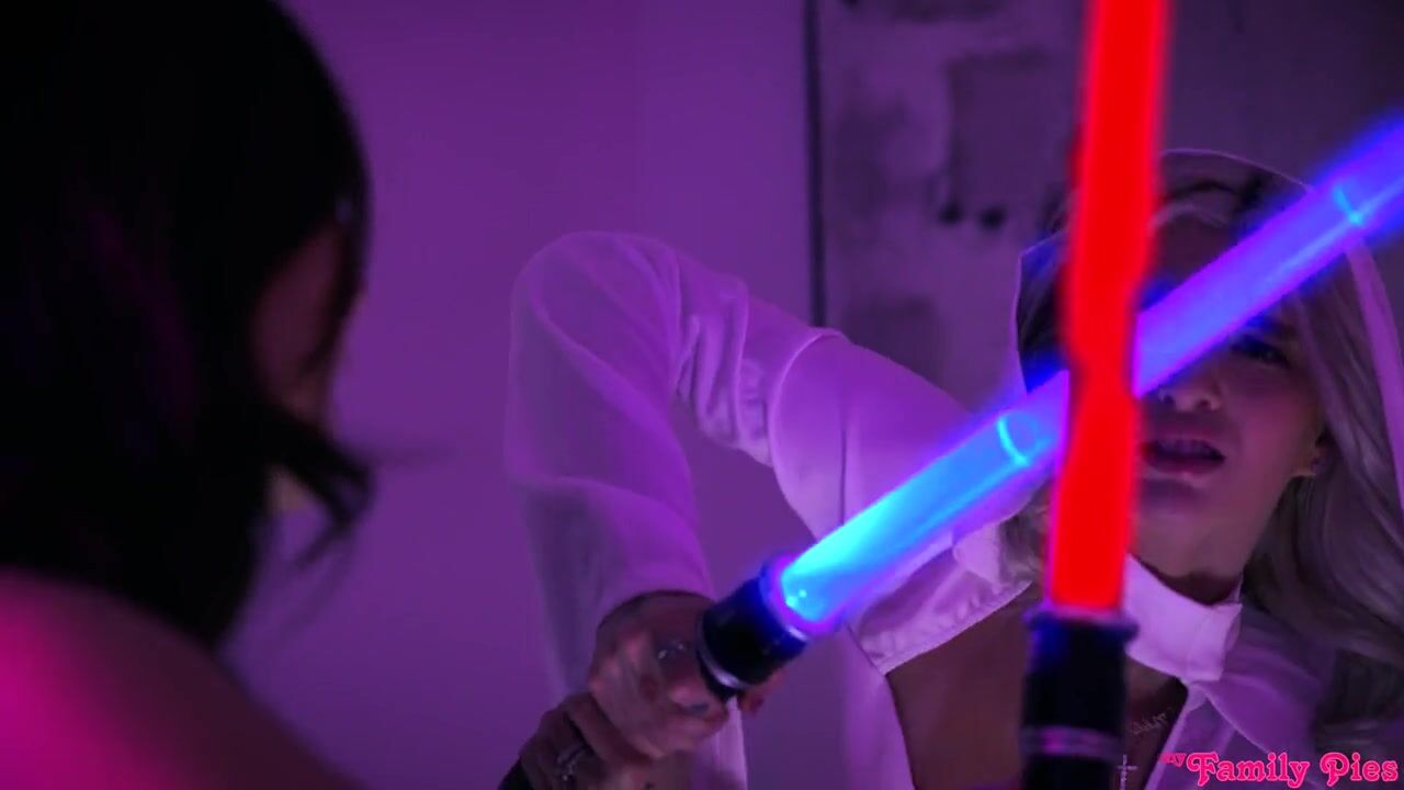 In this installment of Star Whores, Emma Rosie is a member of the chastity side. She sees her stepbrother, Ricky Spanish, as he's in his room changing. Although she wants Ricky, she slips away without acting on it. Her BFF Kimmy Kimm tries to get her to join the lust side, but Emma resists.Later, Kimmy corners Emma for another crack at getting her to enjoy the power of the lust side. Emma denies it, but she keeps getting increasingly sexual visions of her future on the lust side. When she finally gives in, Kimmy promises Emma that the future is going to be sexy. Emma finds herself converted after another hot vision, so the girls go to Ricky's room to make it all reality.There's no hesitation as the girls tell Ricky he needs a good fucking. Pushing him back on the bed, they pop his already hard dick out to suck him off together. Then Emma climbs onto Ricky's hardon to finally feel that nice cock inside her. Kimmy rides Ricky in reverse cowgirl, then gets on her back so Ricky can show her why the dark side is king even as Emma climbs onto her tongue to muffle Emma's moans. Switching back to Emma's pussy, Ricky makes his stepsister squeal and then gives her a creampie that'll keep her on the lust side forever.