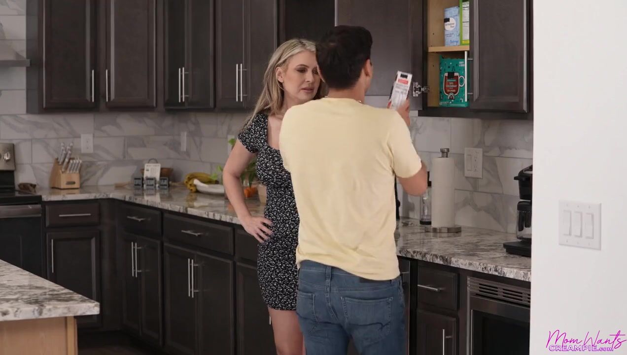Gigi Dior can't quite reach the top of the cabinet to put her groceries away. She calls her stepson, Max Fills, to be tall for her. When Max asks if there's anything else he can do for his stepmom, she asks him to cum in her panties so she can wear them. Sliding them off, she hands them to Max, who jerks off and does as he's told.Later, Gigi comes to Max's room wearing a do me nightie. She wants another round of cum in her panties, but this time she wants it fresh from the tap. Max doesn't nut as quickly, so Gigi keeps escalating what she's doing to help. First it's a handie, but soon it's a blowjob. When Max still can't give her some jizz. Gigi goes for the full fuck.Crawling on top of Max, Gigi sinks down onto his fuck stick to ride him in cowgirl as he worships her titties. Then Gigi goes to her knees so Max can fuck her in doggy. Rolling onto her back, Gigi begs Max with her fuck me eyes until he gets her moaning. She begs him to cum in her panties, which he pulls out and does.