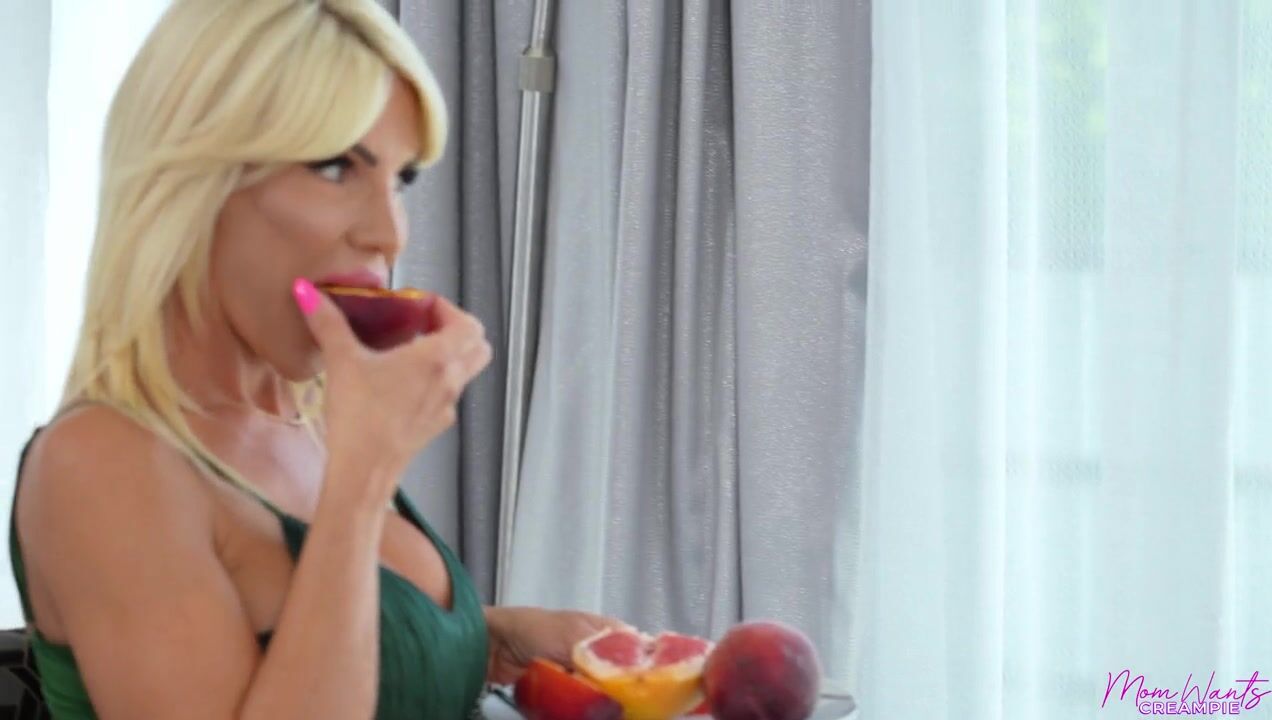 While Nikki Nutz is reading, his stepmom Tiffany Rousso comes to join him. She's eating fruit and licking them sensually while staring at her stepson. When Nikki doesn't immediately respond, Tiffany gets more and more obscene with her comeons. Eventually she has a grapefruit between her thighs that she mimes sex with.Sending Nikki to get the whipped cream, Tiffany tells him to spray it on the grapefruit. Nikki tries to back away, but Tiffany tells him it's okay as she grabs him and presses his face to her magnificent tits. Tiffany finally gets the pussy licking she's been craving, and in return she blows her stepson's mind along with his cock as she sucks with those puffy lips.When Tiffany has finished delivering a titty fuck, she crawls onto Nikki's lap and sinks down onto his hardon so she can ride him as he suckles her nips. Then she lays on her back and lets him set the pace as he pounds that puss. Tiffany enjoys a spooning fuck and then gets on her knees so Nikki can dick her down in doggy. Riding her stepson's hardon in reverse cowgirl, Tiffany doesn't stop until Nikki blows his load for a nice creampie.