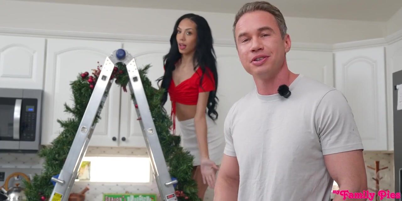 On today's episode of Stepdad How Do I, Big Dick Nick and his stepdaughter Bianca Bangs are showing some tips for holiday prep. Nick helps Bianca learn how to wrap a gift. Then, Bianca insists that Nicko hold her booty for safety as she climbs a ladder to put up a garland. They finish with a segment about decorating a Christmas tree.When it's time to put the star on top of the tree, Bianca takes a moment to remove her thong and hang it on the tree. After hanging the star, she tells Nick that there's still one more thing to do. He's happy to eat that pussy right then and there. Coming down from the ladder, Bianca kneels to suck her stepdaddy off, too.The ladder keeps coming in handy as Bianca peels off her clothes and uses it for balance as stepdad fucks her from behind. Relocating to the couch, Nick takes a seat so Bianca can ride him in cowgirl. They wind down as Nick eases Bianca onto her back and goes to town on that landing strip snatch until he has filled her right to the brim with a big creampie.