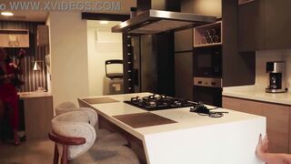 Cougar seduces her niece's boyfriend while she works in the living room.